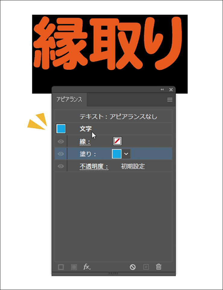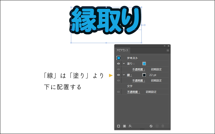 アピアランスを使うと、文字の[塗り]や[線]を複数設定して、さまざまな縁取り文字を作ることができます。いったん縁取りを設定してしまえば、あとから追加した文字や変更した文字にも自動的に同じ縁取りがつくため、文字の修正に強いのが特徴です。