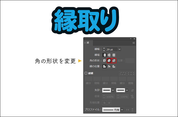 ただし、このとき文字の形状によっては縁取りにトゲのような突起ができてしまうことがあります(図3)。その場合は、線パネルで[角の形状:ラウンド結合]または[角の形状:ベベル結合]に変更するとトゲをなくすことができます(図4)。