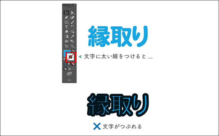 文字を選択した状態でツールバーの[線]のカラーを設定すると、文字の輪郭に線をつけることができます。しかし線パネルなどでその[線幅]を太く設定すると、文字がつぶれてしまうことがあります(図1)。
