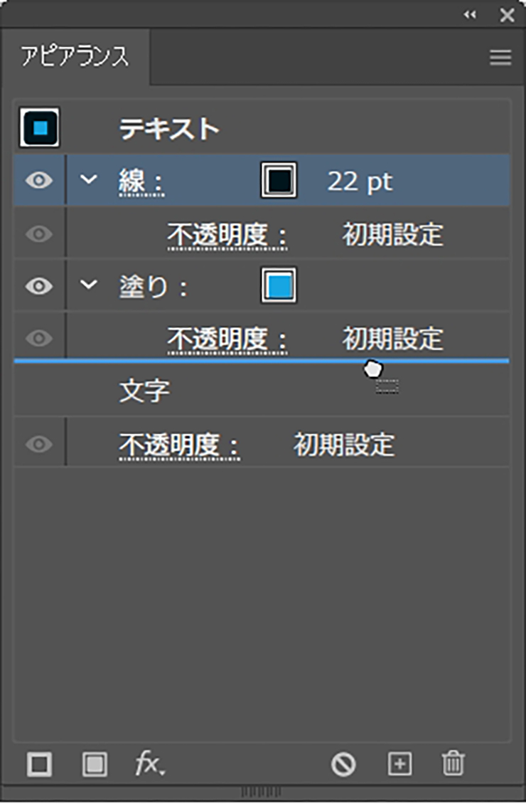 そのとき[線]が[塗り]の前面(パネル上では上側)にある場合は、太い線にしたときに文字がつぶれてしまうため、パネル上でドラッグ&ドロップして[塗り]の背面(パネル上では下側)に移動しておきます(図10)。こうすると、太い線にしても文字がつぶれません(図11)。