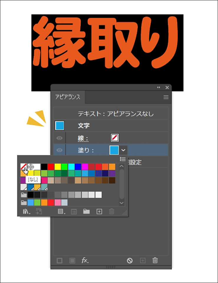 アピアランスを使うには、ウィンドウメニュー→“アピアランス”を選んで「アピアランスパネル」を表示させておきます。続いて選択ツールで文字を選択し、アピアランスパネルの[文字]をダブルクリックして[塗り]と[線]を[なし]に設定します(図5)(図6)。これによって、ベースの文字が無色透明になります。