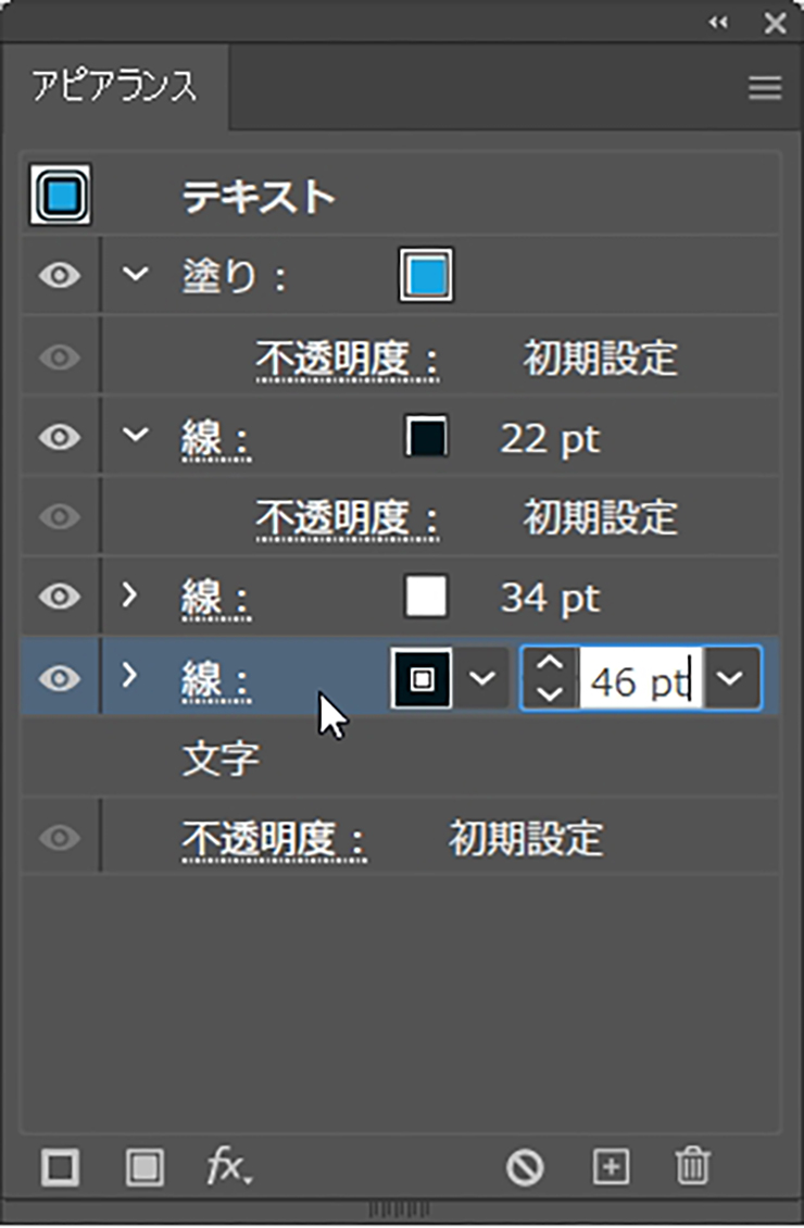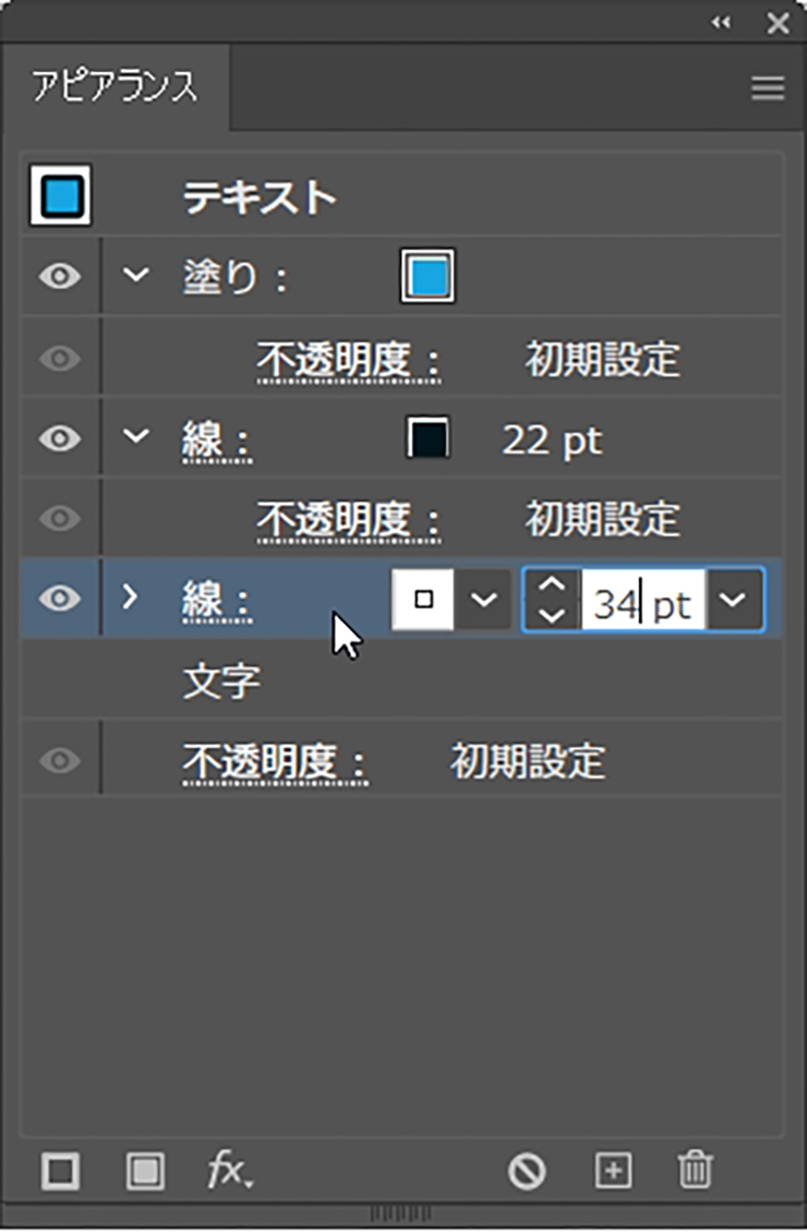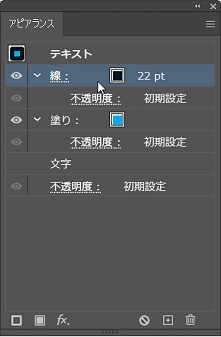 アピアランスパネルの左下にある[新規線を追加]ボタンをクリックすると、そのたびに線が追加されます。これを利用すると、二重縁取りのような表現を簡単に実現できます。