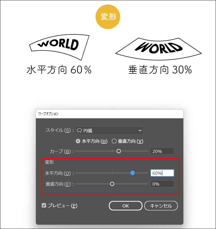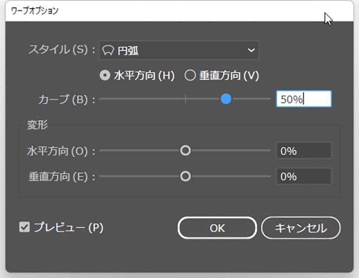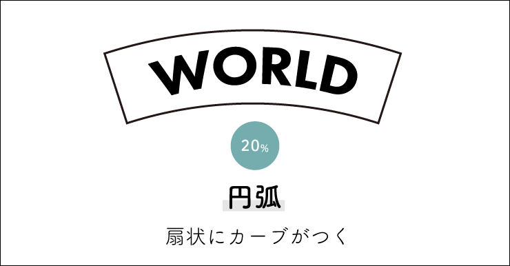 「円弧」は、扇状にカーブした形に変形できます(図6)。効果メニュー→“ワープ”→“円弧...”を選ぶと、「ワープオプション」ダイアログが表示されるので(図7)、必要に応じて設定を変更して適用しましょう。