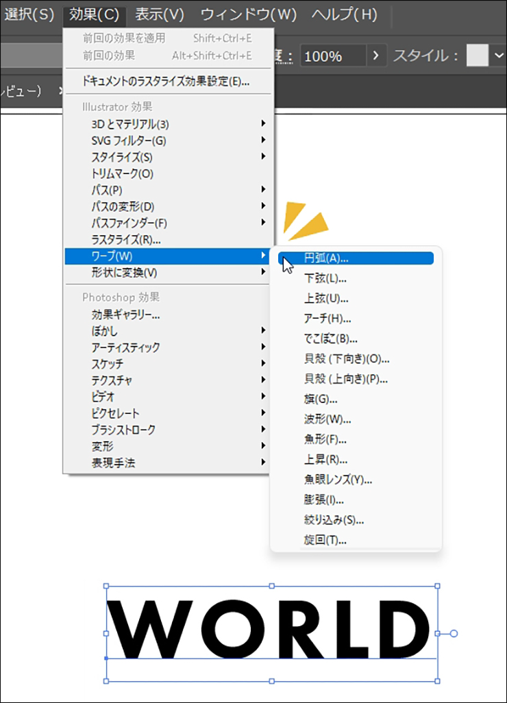 Illustratorには、テキスト情報を保ったまま文字を変形できる「ワープ効果」も搭載されています。使い方は簡単で、テキストを選択した状態で、効果メニュー→“ワープ”から“円弧”や“アーチ”などの15種類のスタイルを選べばOK(図5)。スタイルの名称から想像できるような形に変形できます。
