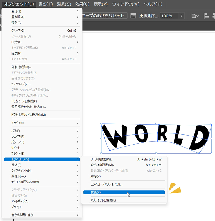 変形したあとに、オブジェクトメニュー→“エンベロープ”→“拡張”を実行すると、通常のオブジェクトとして扱えるようになります(図17)。ただしテキスト情報が破棄されるため、“拡張”を実行したあとはテキストを修正することはできなくなります。