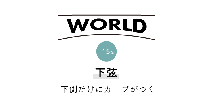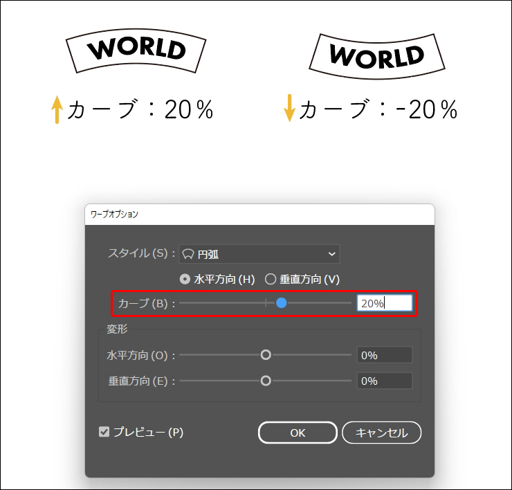 「下弦」では、文字の下側だけをカーブさせられます(図11)。数値を大きくすると下辺中央がふくらんだように変形し、マイナスまで数値を減らすと逆に下辺中央がへこんだ形になります。ロゴなどでよく見かける形状ですね。