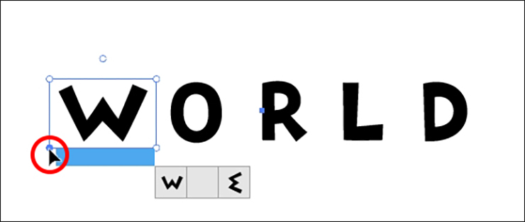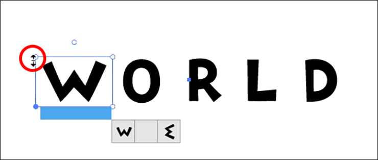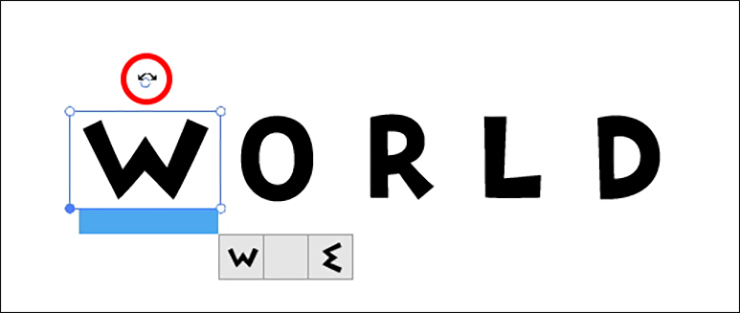文字タッチツールで調整したい文字をクリックすると、その周囲にバウンディングボックスのような枠が表示されます。枠の上にあるハンドルをドラッグすると、その文字を回転することができます(図20)。