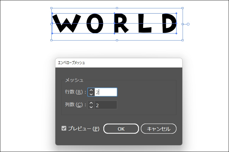 [行数]と[列数]を決めて[OK]をクリックすると、その設定にしたがってテキスト全体にメッシュが表示されます。このメッシュは、ダイレクト選択ツールやメッシュツールなどでアンカーポイントとハンドルを動かすことで変形することが可能です。