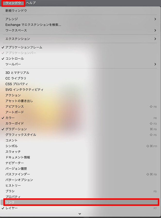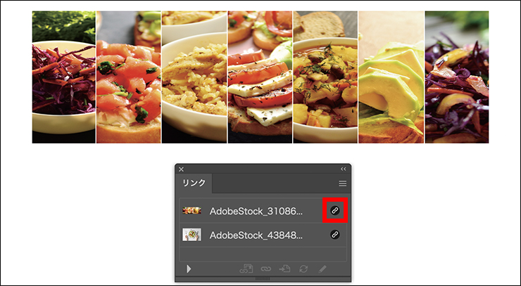 なお、画像がリンクされているのか?埋め込まれているのか?を確認する方法は、ウィンドウメニュー→“リンク”でリンクパネルを開き(図11)、該当する画像のレイヤーの右側を確認します。リンク(鎖)のマークがついていた場合は、リンクされた画像となります(図12)。
