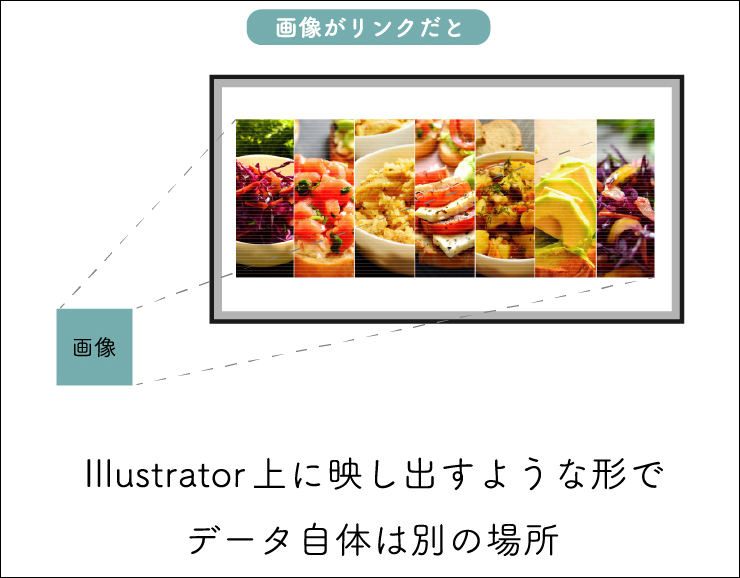 画像をリンクで配置した場合は、データ自体は別の場所にあるものをIllustrator上に映し出すようなイメージとなるので、データが軽くなります(図8)。