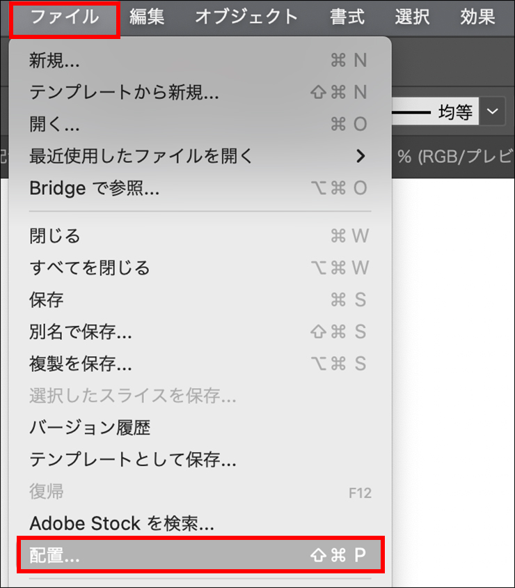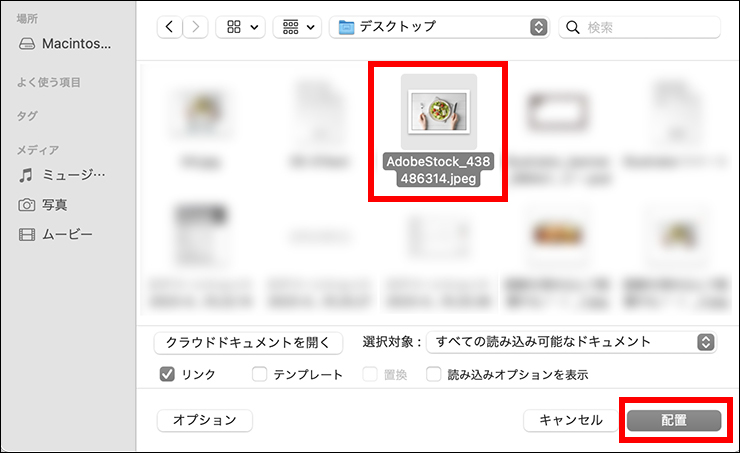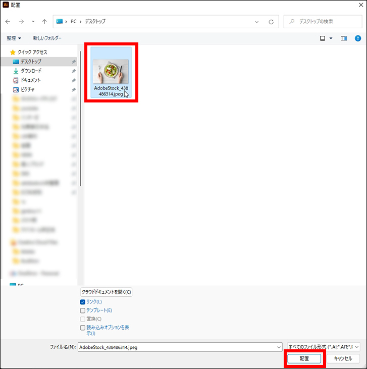 まずは、Illustratorで画像を配置します。ファイルメニュー→“配置...”で表示されたダイアログ内の画像ファイルを選んで[配置]を押したあと(図1)(図2)、画面上をクリックして画像を配置します(図3)。