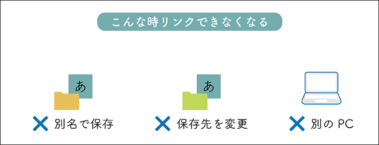 ただし、データが別の場所に保存されているからこそのエラーも起きます(図9)。リンクの状態では、「〇〇フォルダにある□□という画像を表示する」という設定になっています。