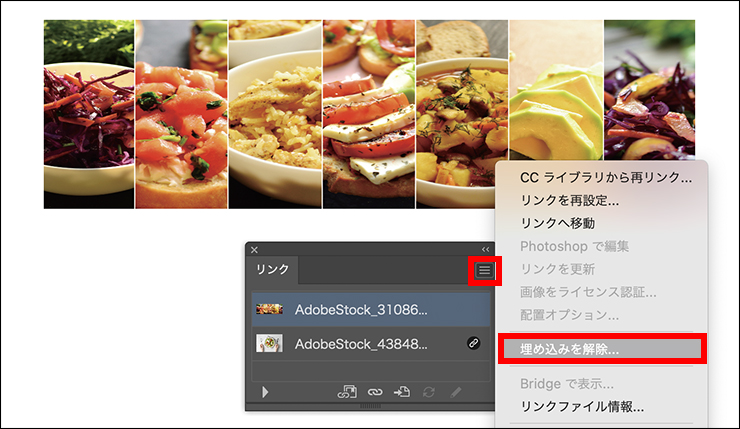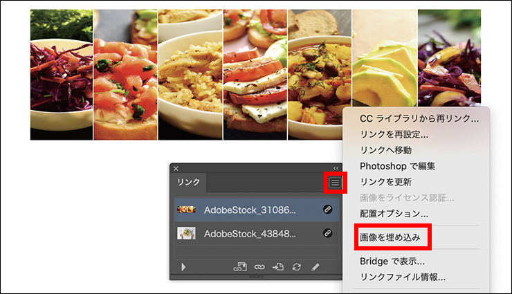リンクされた画像を埋め込みの画像に変更したい場合は、リンクパネルで該当の画像のレイヤーを選んだ状態で、右上のメニューから[画像を埋め込み]をクリックします(図13)。すると、リンクのマークが外れて埋め込みの画像にできます。
