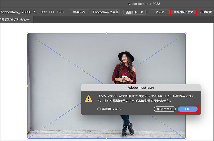 配置した画像を選択した状態で、コントロールパネルの[画像の切り抜き]をクリックします。メッセージが表示されますが、そのまま[OK]を押します(図5)。