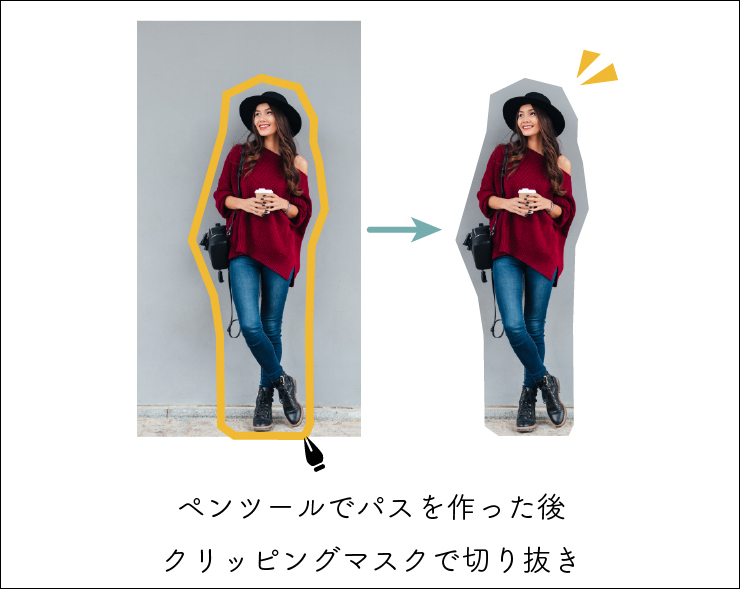 たとえばペンツールなどで人物の周りにパスを作った後、先ほどと同様の手順でクリッピングマスクを作成すると、パスの形で画像を切り抜くことができます(図17)。