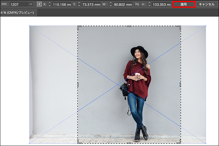 これで他のソフトのようにドラッグするだけで画像がトリミングできます(図6)。バウンディングボックスのような点線のガイドが表示され、ガイドの外側が切り抜かれる範囲です。