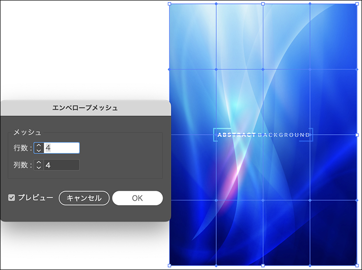 まずは合成する画像を選択した状態で、オブジェクトメニュー→“エンベロープ”→“メッシュを作成...”をクリックします(図13)(図14)。メッシュを作成することで、画像に対して自由な変形が可能になります。