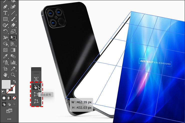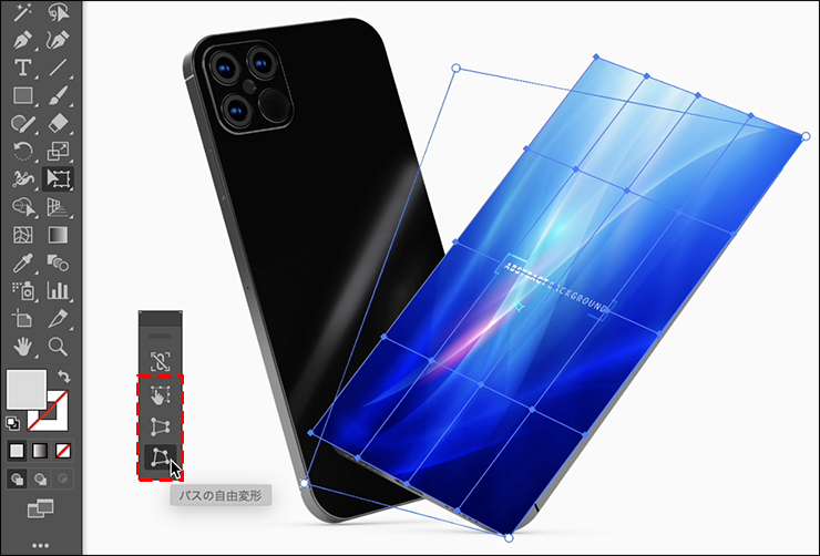 次に自由変形ツールのタッチウィジェットで[自由変形]や[パスの自由変形]などを切り替えながら、スマートフォンのディスプレイの形に合わせて、画像の辺がディスプレイの辺と平行になるように変形させます(図16)(図17)。