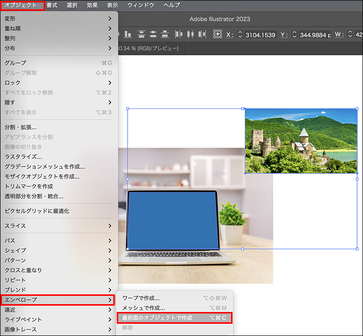 次に作成した四角のオブジェクトを選択した状態で、オブジェクトメニュー→“重ね順”→“最前面へ”をクリックしたら(図7)、shiftキーを押しながら合成する画像(ここでは風景画像)も選択して、オブジェクトメニュー→“エンベロープ”→“最前面のオブジェクトで作成”をクリックすると(図8)、画像がモニターの形に自動で変形・合成できます(図9)。