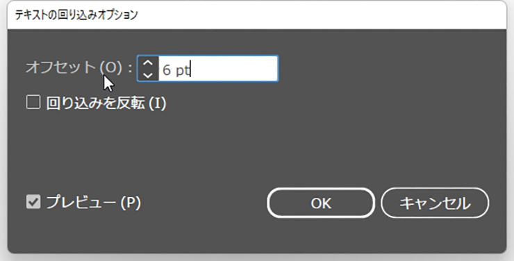 すると「テキストの回り込みオプション」ダイアログが表示されます(図5)。この[オフセット]の数値が、画像とテキストの間隔になります。数値を大きくすると、それに合わせて画像の外側の枠も大きくなって間隔が広がります(図6)。