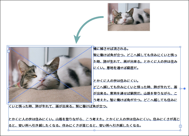 選択ツールでこの画像をドラッグしてテキストの前面に移動させると、画像の周囲にテキストを回り込ませることができます(図4)。画像の位置をずらしても、それに合わせて自動的に画像を避けるようにテキストが再配置されます。