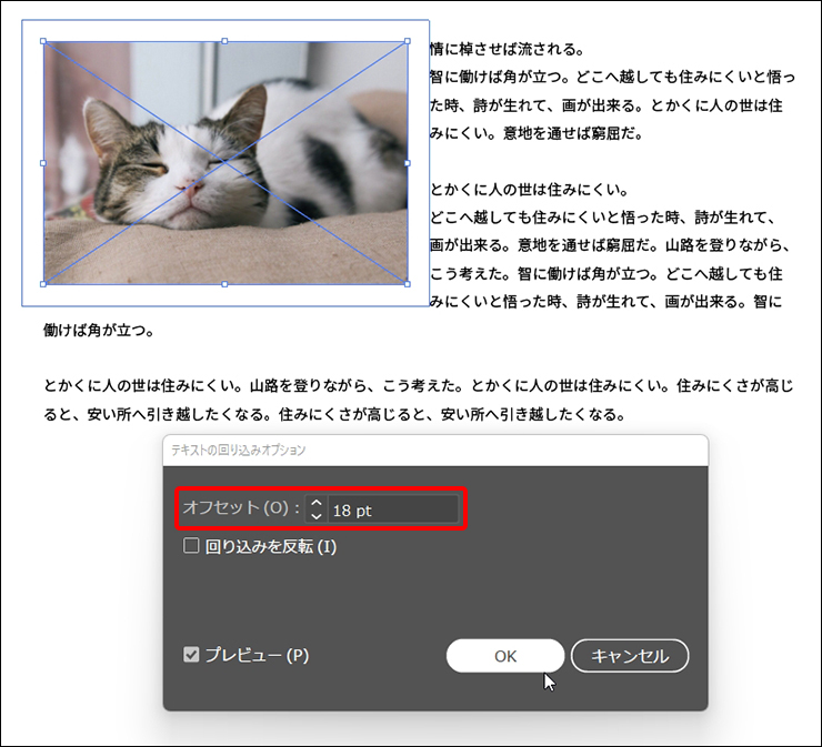 まず、画像を選択したら、オブジェクトメニュー→“テキストの回り込み”→“テキストの回り込みオプション...”を選びます。