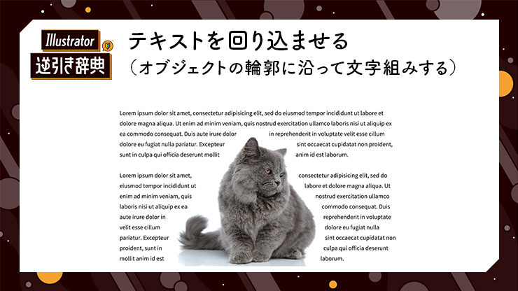 Illustrator(イラレ)で、画像や図形などのオブジェクトの周囲にテキストを回り込ませる(オブジェクトの輪郭に沿って文字組みする)方法を解説します。オブジェクトとテキストの間隔を調整する方法や、回り込ませる際の注意点についても併せて紹介します。
