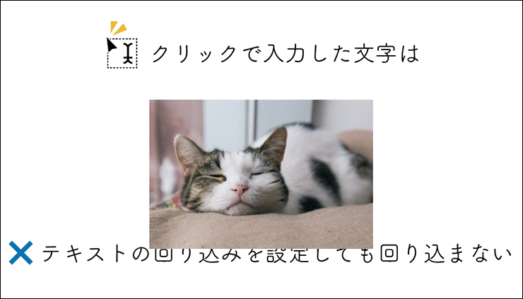 たとえば、文字ツールで画面上をクリックして入力した文字(ポイント文字)に対しては回り込みが適用されません(図8)。回り込みができない場合は、文字ツールで画面上をドラッグして入力した文字(エリア内文字)であることを確認しましょう。