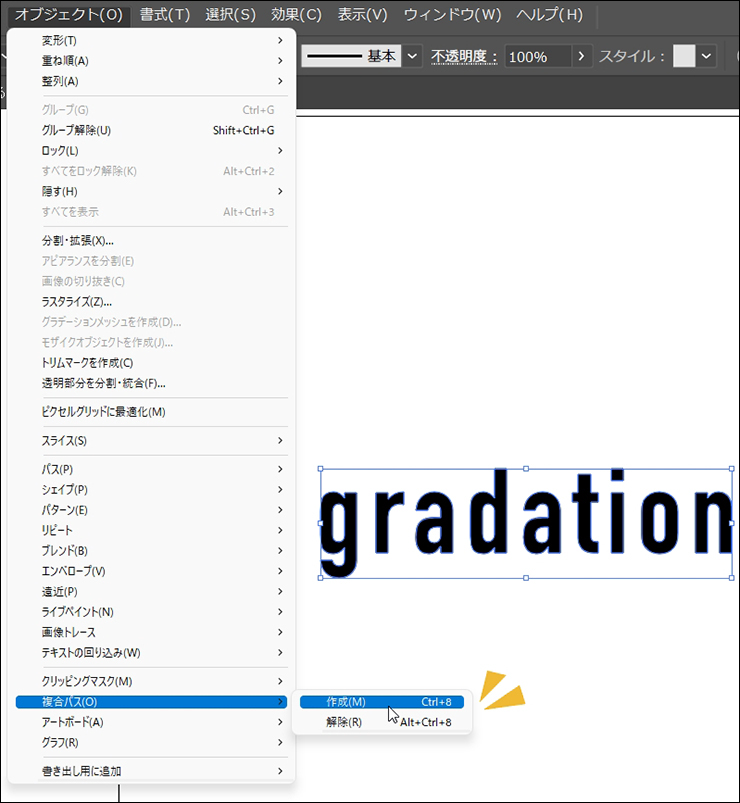 文字ごとではなく文字列全体にグラデーションをかけるには、複合パスを利用します。複合パスとは、簡単に説明すると複数のパスをひとつのパスとして扱う機能です。