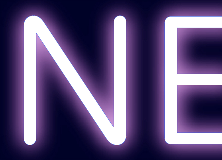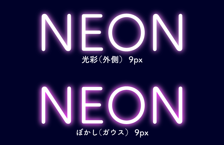 「光彩(外側)」で作成したネオン文字と比べてみると、「ぼかし(ガウス)」のネオン文字の方が色や光が強い印象になっているのが分かります(図14)。