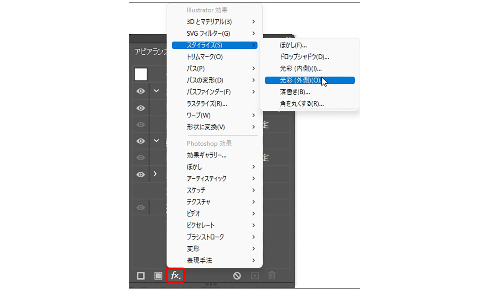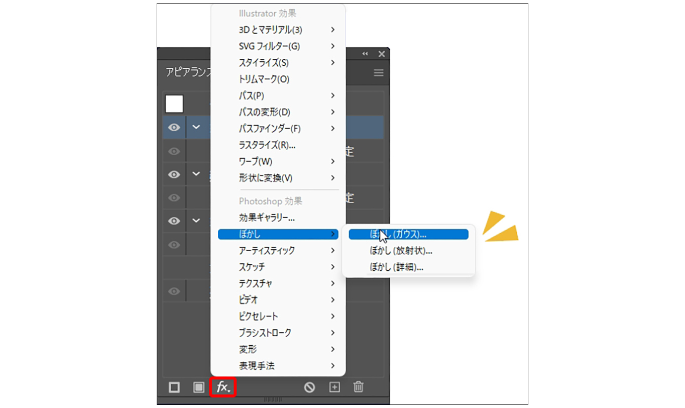 アピアランスパネルで[塗り]に発光したような効果を与える際、「光彩(外側)」ではなく「ぼかし(ガウス)」を適用すると、より光の印象を強めることができます。