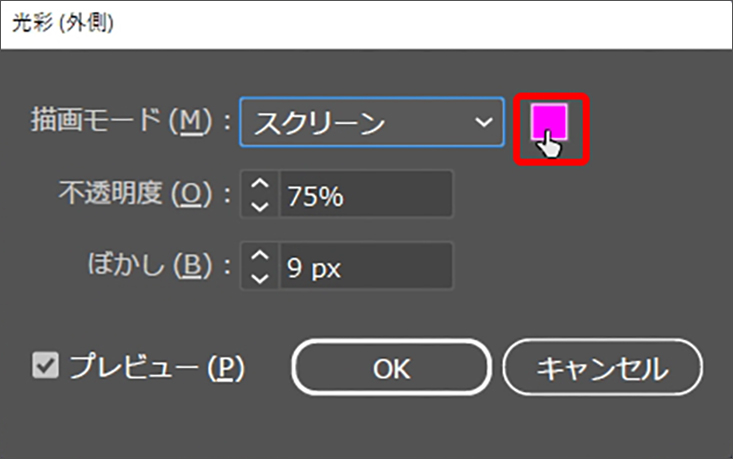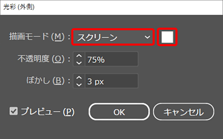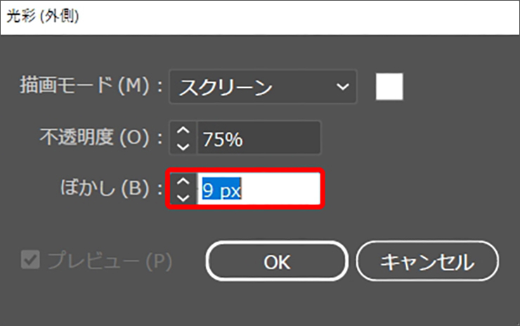 すると「光彩(外側)」ダイアログが表示されるので、[描画モード:スクリーン]、[光彩のカラー:ホワイト]に設定します(図7)。発光量を増やしたい場合は[ぼかし]の数値を大きくしてから適用します(図8)。ここでは[ぼかし:9px]に変更しましたが、文字の大きさによっても最適な値は異なるのでプレビューを参考にしながら調整してみてください。