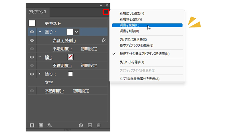 手順は、アピアランスパネルで先ほど「光彩(外側)」を適用した[塗り]を選択した状態で、パネル右上の三本線のアイコンをクリックしてパネルメニューを開き、“項目を複製”を選択します(図10)。