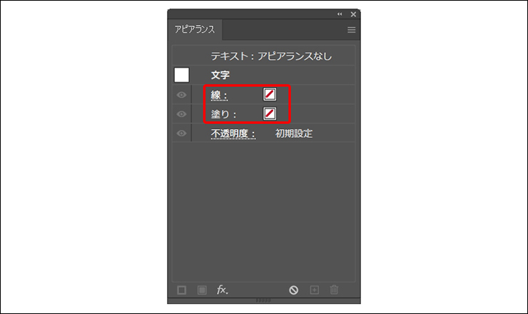 続いて文字ツールでドラッグして入力した文字を選択し、アピアランスパネルでいったん[塗り]と[線]を[なし]に設定します(図2)。