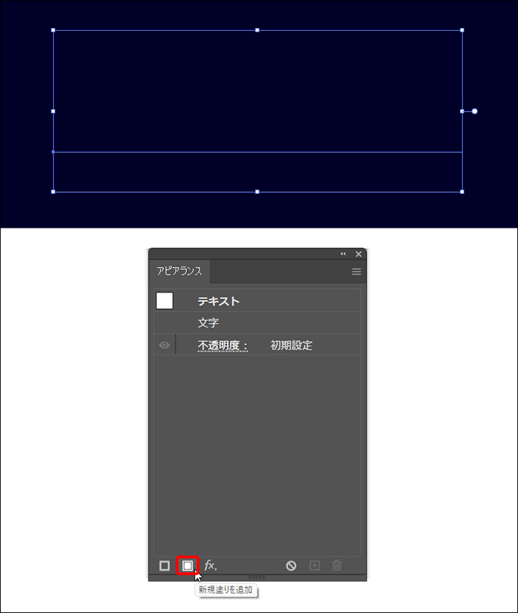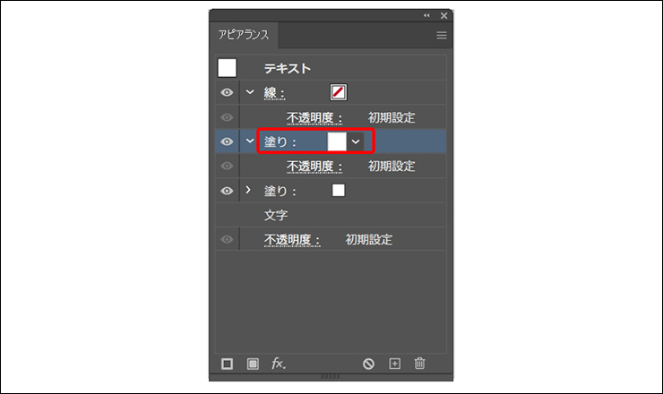 次に選択ツールで文字を選択したら、アピアランスパネルの下部にある[新規塗りを追加]ボタンをクリックして(図3)、[塗り]をホワイトに設定します(図4)。これが文字の色になります。