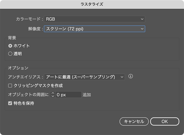 「ラスタライズ」ダイアログが表示されて解像度などを設定できますが、モザイクにしてしまうので解像度はどの設定でも構いません(図10)。