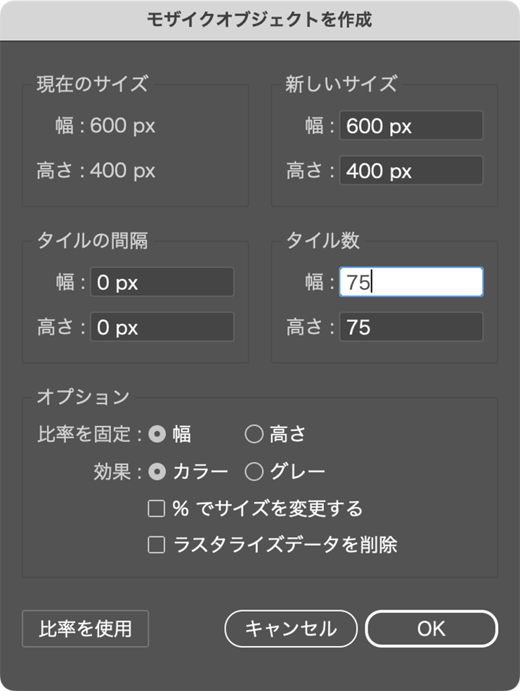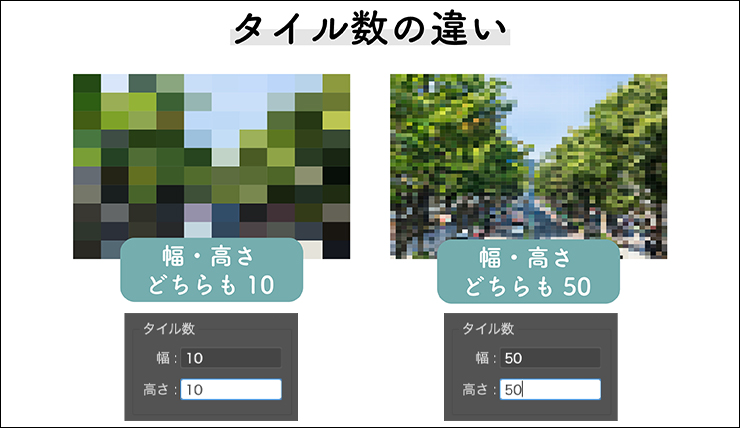 モザイクの細かさは、[タイル数]で調整します(図6)。[タイル数]の[幅]と[高さ]の数値が少ないほどモザイクが粗く、数値が大きいとモザイクが細かくなります。