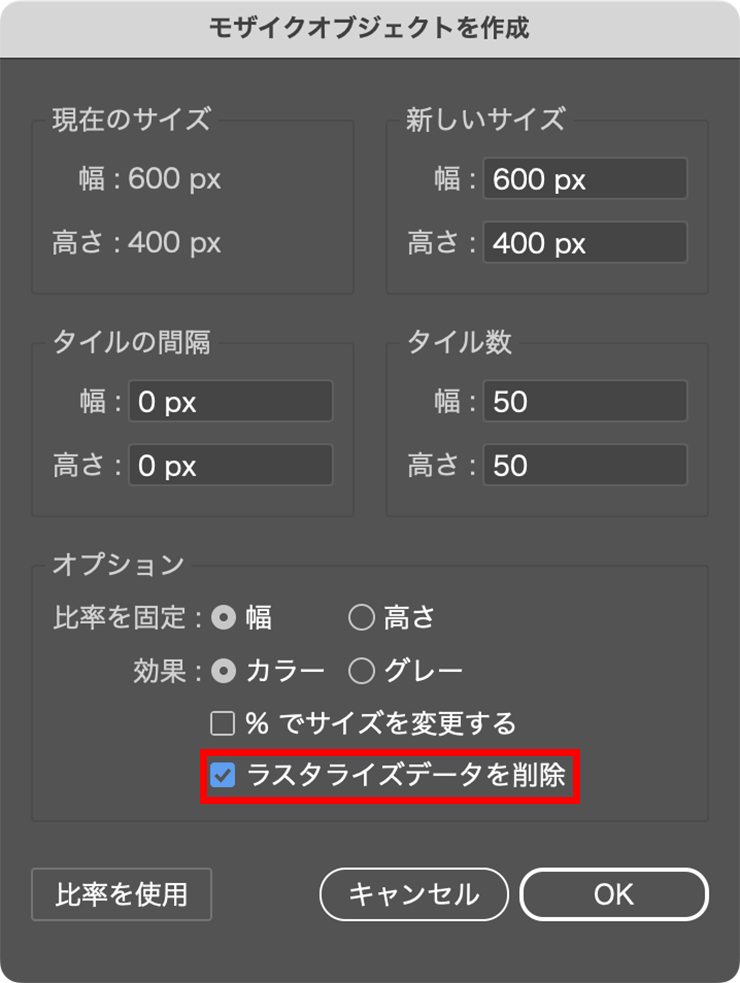 元の画像がいらない場合は、ダイアログの[ラスタライズデータを削除]にチェックを入れておくと、背景の画像を削除してモザイクをかけることができます(図8)。