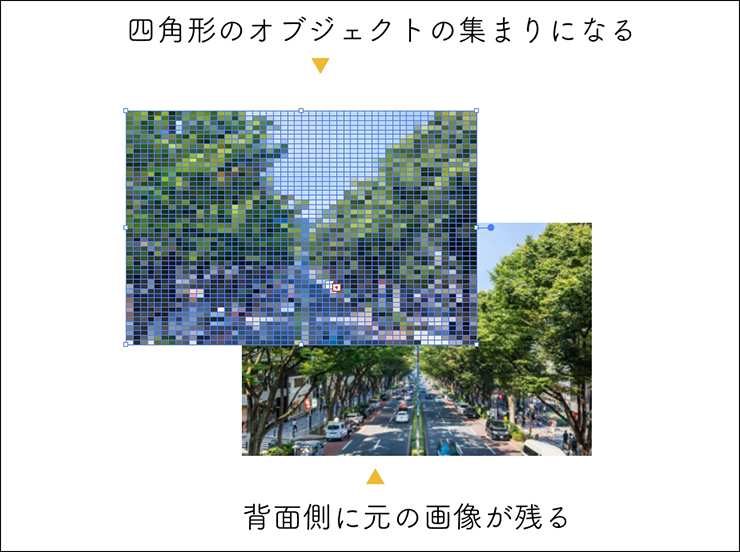 [モザイクオブジェクトを作成]を適用すると、画像はモザイクになりますが、モザイクは画像の色を使った四角いオブジェクトの集まりという状態になって、その変わりに背面には元の画像が残ります(図7)。