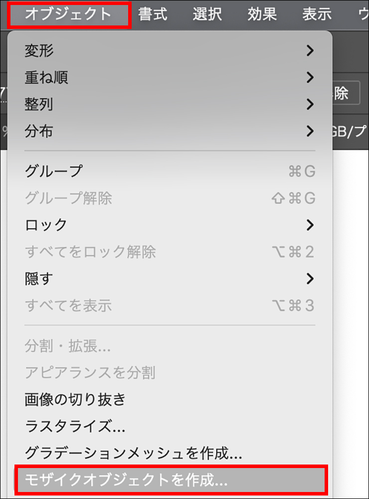 次に、オブジェクトメニュー→“モザイクオブジェクトを作成...”をクリック(図3)。