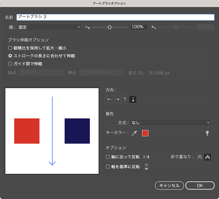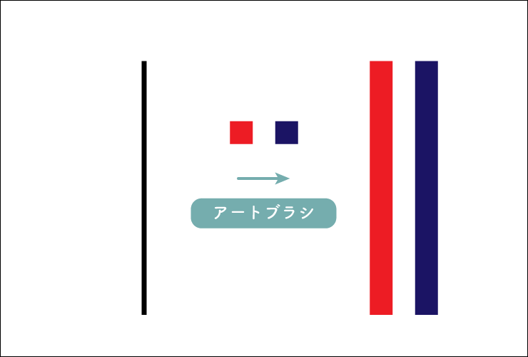 アートブラシは、登録したオブジェクトがストロークの長さなどに応じて引き伸ばされます(図17)。そのため、引き伸ばされても支障のない柄を登録した方が使いやすいです。たとえば図のように赤、白、青の正方形のオブジェクトを横に並べてアートブラシとして登録すると(図18)、トリコロールのストライプを手軽に描けます。