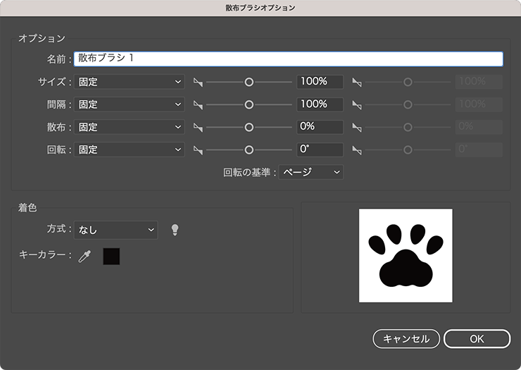 散布ブラシは、登録したオブジェクトをランダムに散布したいときなどに使います(図15)。オプションでは、[サイズ]や[間隔]、[散布]、[回転]などの項目があり、どれも初期設定では[固定]になっていますが(図16)、その右横にあるスライダーを動かすことでランダムさを変更することができます。必要に応じて設定を変更して[OK]をクリックすると、登録したオブジェクトをランダムに散布するブラシを作成できます。