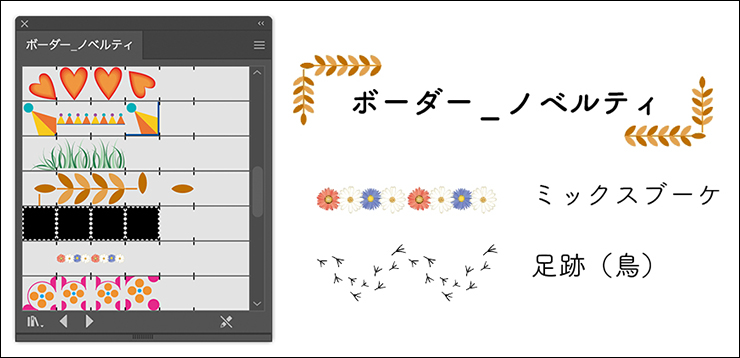 ブラシライブラリメニュー→“ボーダー”→“ボーダー_ノベルティ”には、図形などの縁(ボーダー)につけるのに向いたブラシが含まれています。飾り罫などに使いやすいのですが、ほかのIllustratorユーザーとかぶりやすいので注意が必要です(図11)。