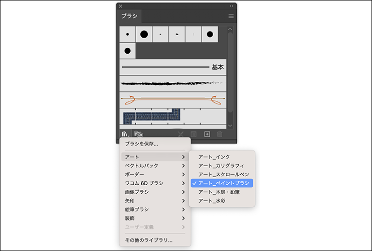 ブラシパネルの左下の[ブラシライブラリメニュー]ボタンをクリックすると(図7)、「アート」や「ベクトルパック」、「絵筆ブラシ」など分類されたブラシライブラリが表示されるので、好みのものを選択します(図8)。