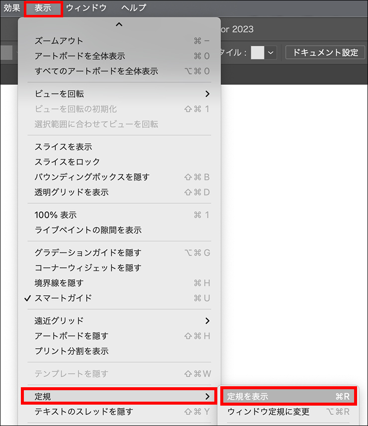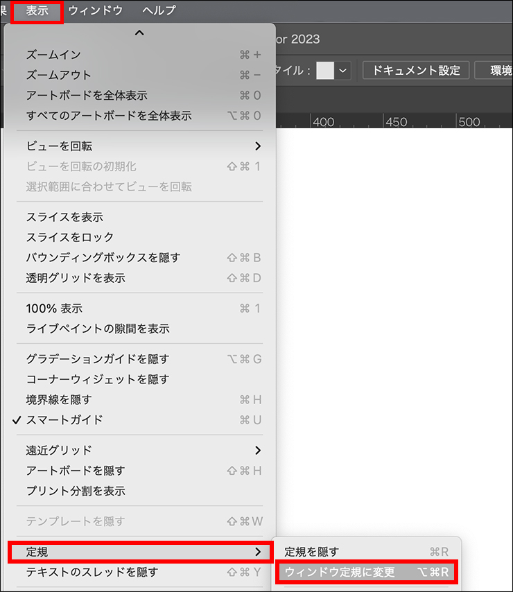 定規は「ウィンドウ定規」と「アートボード定規」の2種類あり、表示メニュー→“定規”→“アートボード定規に変更”、または表示メニュー→“定規”→“ウィンドウ定規に変更”で切り替えられます(図4)。