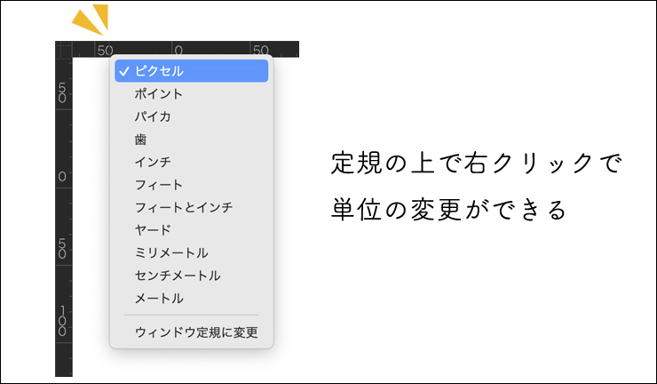 また、定規の上をクリックしてドラッグすると、オブジェクトを正確に配置するための目印となるガイドを引き出すことができ(図7)、定規を右クリック(Macの場合はcontrolキーを押しながらクリックでもOK)するとドキュメントの単位を変更することもできます(図8)。覚えておくと便利です。