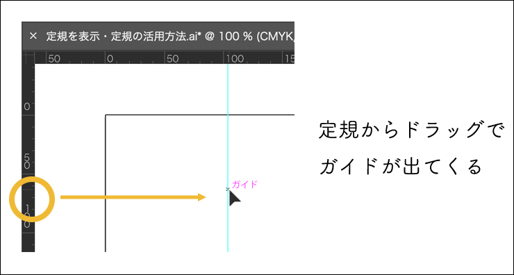 Illustratorで定規を表示するには、表示メニュー→“定規”→“定規を表示”を選択します(図1)。画面の上部と左側に目盛が表示されますが、これが定規です(図2)。
