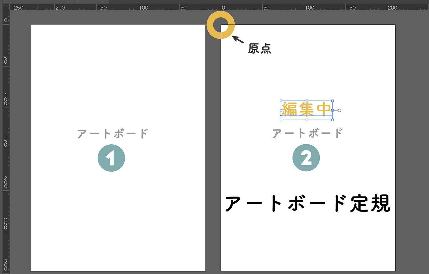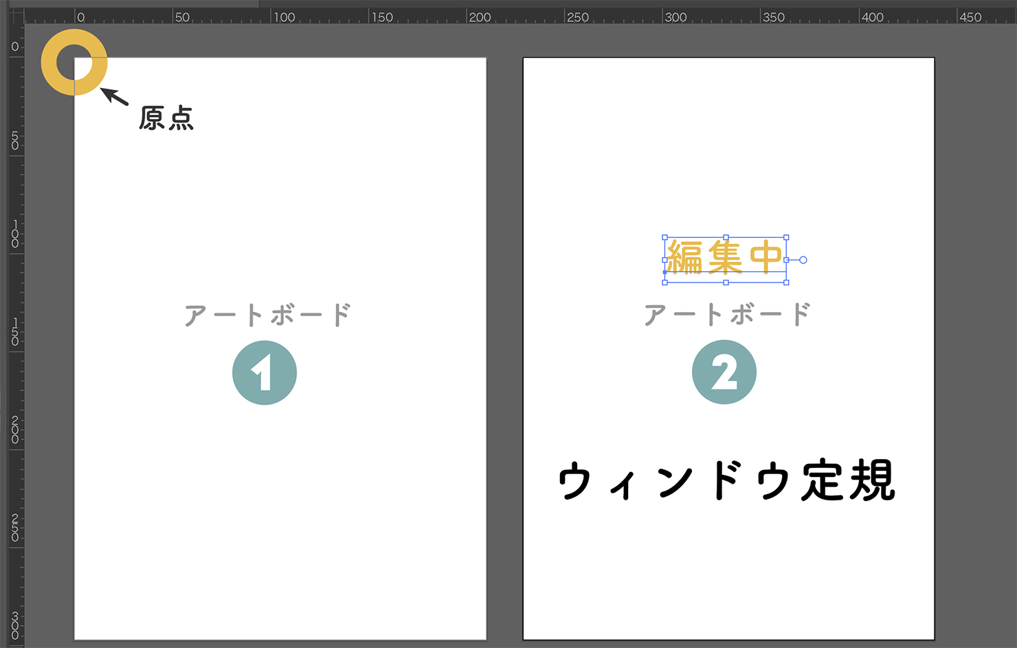 一見、どちらも同じように見えますが、アートボード定規が編集中のアートボードの左上隅が原点になるのに対し(図5)、ウィンドウ定規は常に1枚目のアートボードの左上隅が原点になるところが異なります(図6)。