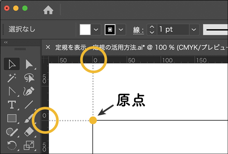 定規の縦横ともに「0」と表示される部分を「原点」と呼びます(図3)。