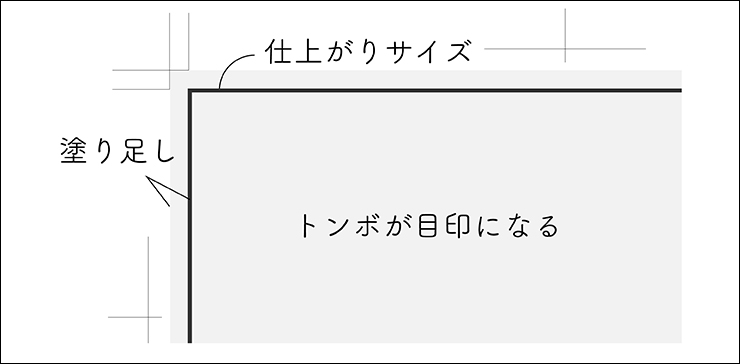 ただ、このままだと実際の仕上がりのサイズがわからなくなってしまうので、仕上がりサイズの目印としてトンボが使われます(図8)。